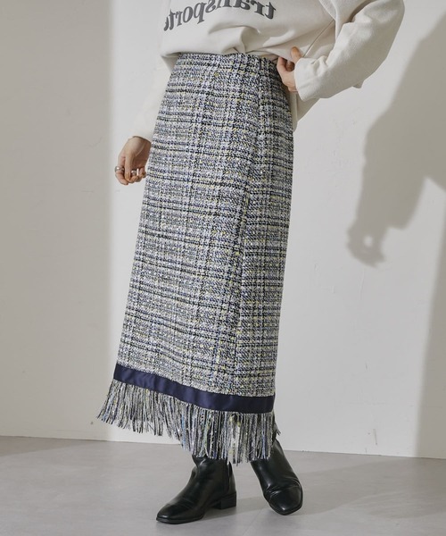 mona Belinda 2021AW 『レトロな雰囲気漂う』 【ポイント】 ・レトロな印象のツイード生地。 ・こなれた雰囲気になるフリンジデザイン。 ・程よいアクセントになる裾テープ。 ・ウエスト周りをラクにするバックウエストゴム。 ・着脱しやすいサイドジップ仕様。 ---------------------------- 伸縮性 なし 透け感 なし 生地の厚さ ★★★☆☆ 裏地 あり ---------------------------- 【オススメコーディネート】 Iラインのスカートなので ボリューム感のあるトップスと相性バツグン。 カジュアルがお好きな方はスウェットとの着こなしだと メリハリのあるオトナカジュアルなスタイルに。 「キーワード」 ツイード タイトスカート デザインスカート トレンドアイテム ------------------------------------------------------------- *気になるアイテムは《お気に入り登録》がオススメ! 入荷情報やセール情報が通知されるようになります。 「ブランドお気に入り登録」で新商品や再入荷など、 お得な情報を受け取ることができます。 ※画像は光の具合で色味が違って見える場合があります。 --------------------------------------------------------------