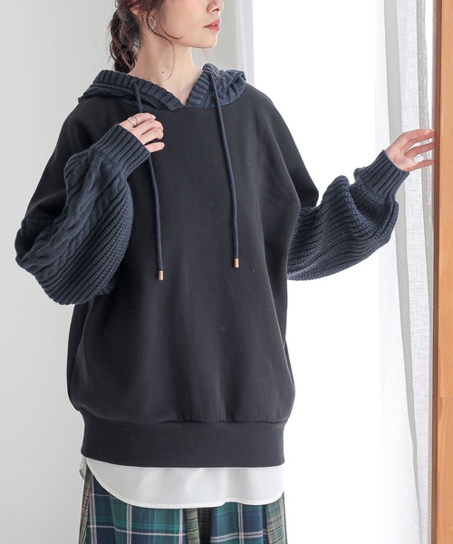 .........................................★ 大人気アイテム再入荷! ★\『暖かさ、色合い、デザイン全部こだわりました!』/**お客様のお声にお応えして、人気の裏起毛異素材トップスが復活。**ゆったりサイズで楽に着やすいニットパーカー.........................................【あったか裏起毛バイカラートップス】ニットと裏起毛スウェットの異素材使いが、着るだけでお洒落見えを叶えるアイテム。【着るだけで着こなせる。華奢見えシルエット】ドルマンシルエットでゆるっとラフに着用でき、 ボリュームのあるぽわん袖が華奢見せを叶えます。ケーブル柄と配色使いが印象的な、着こなしに差のつく一着。【お洒落・着心地どっちも妥協なし!】「デザイン」も「着心地」もこだわるずっと触れていたくなるような、肌触りの良い裏起毛スウェット。立体感のあるローゲージのケーブルニットをドッキング。秋冬を暖かくお洒落に過ごせる生地感です。【いつものボトムスでコーデ格上げ】手持ちのスカート、デニムにあわせるだけでゆるっとかわいいコーデに。暖かいのにお洒落な着こなしが叶います。着回し力抜群の大人女子にうれしい裏起毛スウェット×パーカーです。■製品についての注意書き【ローゲージニットにつきまして】やわらかな糸を数本合わせて編むことにより、独特のざっくりした風合いを出しております。先の尖ったものや、ざらついたものに引っかかり、糸が飛び出すことがございますので着用時にご注意お願いいたします。組織の特性となります為、ご了承の上ご購入いただきますようお願いいたします。【size】肩幅:78cmアームホール:42cm袖丈:40cm袖口周り:16cmバスト:126cm裾周り:92cm着丈:68cmフード(丈×幅):39×27cm.........................................n'OrLABELほかにない、私のデイリーウェア毎日の生活を心地よく自分らしく過ごすための服。遊び心を取り入れた、大人のカジュアルスタイル。.........................................