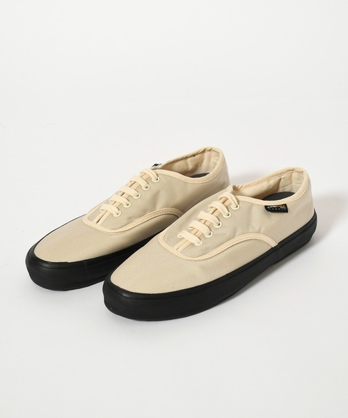 1940年代にかけてアメリカ海軍でトレーニングシューズとして採用されていたスニーカー、通称≪デッキシューズ≫。 年代的にもデッドストックで見つかることはまずないであろうモデル。 それをベースに軍用シューズの生産をしていたファクトリーに依頼し、現代的に再現しています。 水で滑りやすいデッキ(船の甲板)でもグリップを良くする為のボトムソールの形状と、水を逃がす為に少しだけヒールが高くなっているところがポイントです。 使用している500デニールのコーデュラナイロンは生地重量に対しての耐久性が高く、耐水性にも優れます。 生地表面にはデュポン社のテフロン加工を施しており、これにより撥水性と防汚性を確保します。 ■ポイント ・シンプルなデザイン ・グリップの効いたボトムソール ・耐久性と耐水性に優れたコーデュラナイロン使用 ■シルエット デッキシューズの仕様に合わせ、水濡れを回避するためやや高めに設定されたソールが特徴です。 すっきりとしたシルエットのため、合わせるボトムスを選びません。 ■ブランド 【REPRODUCTION OF FOUND/リプロダクションオブファウンド】 見つけ出す:FOUND、再現する:REPRODUCTIONをコンセプトに2016SSよりスタートしたブランド。 ミリタリーシューズシリーズは1950年代~1970年代にかけて数多くの軍用トレーニングシューズを生産していたスロバキア等のファクトリーで、ひとつひとつ丁寧にハンドメイドで生産されています。 ロゴやタグには品名、国名、年代を記載しデザインソースを明かしています。 ミリタリーアイテムを中心に時代を超えた普遍的なアイテムを見つけ出し、現代的に再現させてリリースしています。 ※ソールにブルーム(白い粉のようなもの)が付着している場合がございます。 こちらは素材特性によるもので、100%天然ゴムの場合は紫外線を受けるとすぐに劣化してしまうため配合剤を入れて保護しています。 劣化を防ぐものでございますため、何卒ご了承ください。 ブラッシングや濡れ雑巾等で拭くと緩和しますが、一時的なもので完全には取りきれません。ゴム艶出し、保護剤を塗布するとキレイになります。シューケア用品ではラバーブーツ用の艶出しスプレー等が同様の効果があります。