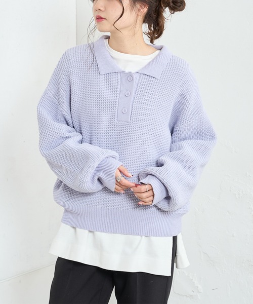 ピュアルセシン 2022 spring collection【Loose and classical】 ◇コーディネートの主役になる、春カラーを入れたポロデザインニット◇ ●デザイン 程よい肉厚感なポロデザインニット。身幅やアームホールにゆとりを持たせ、ボディラインを拾わないのが嬉しいポイントです。 ポコポコと表情のあるリブ編みは存在感があり、1枚でコーディネートの主役級。 小ぶりの襟と首元に並んだ3つの丸ボタンが女性らしい柔らかさを残し、メンズライクになり過ぎない1枚に仕上げました。 ●カラー展開 アイボリー/パープル系/グレーの春先までお召しいただける柔らかなカラー展開 ●素材 アクリルベースのコットン、ポリエステル混素材。 キュッと詰まった編地でふっくらとした程よい肉厚感に仕上げています。 ●スタイリング ゆったりした身幅なのでレイヤードがオススメ。 レースを施したフェミニンなインナーから、スタイリッシュなタートルインナーまで好相性◎ ウエスト丈のニットなのでワイドパンツからスッキリしたシルエットのスカートまで幅広く対応します。 ============================ 透け感:なし 裏地:なし 伸縮性:あり 光沢感:なし 生地の厚さ:やや厚手 【スタッフコメント】 年齢:20代後半/身長:157cm/普段着用サイズ:Mサイズ サイズ感:締め付け感なく着用できるサイズ感。インナーを重ねても違和感がありません。 素材感:柔らかく伸縮性を兼ね備えた素材感。肌あたりも優しく、直接触れてもチクチクしないニットです。 =============================== ※撮影場所やお使いのモニター環境により若干お色味が異なる場合がございます。特にロケの撮影では明るく見える傾向にございます。 ※予約商品はサンプルで撮影をしております。若干の仕様が変更になる場合がございますので予めご了承の上ご注文くださいますようお願いいたします 。