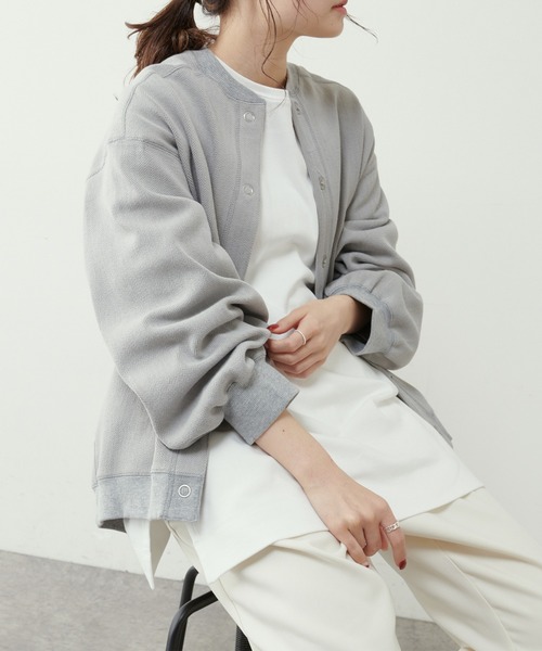 ピュアルセシン 2022 spring collection【Loose andclassical】◇春の軽アウターにもぴったりなリングボタンブルゾン◇●デザインカーディガンにも春先のメインアウターとしても使えるブルゾン。微配色の糸で織りあげられたヘリンボーン柄は存在感がありつつも、スタイリングがしやすく上質さを感じるしっかりとした見た目とストレッチの効いた着心地の良さを叶えています。身幅や袖周りには程良くゆとりを持たせ、ルーズ過ぎないバランスに。上品なイメージのヘリンボーン柄にリングドットボタンを施したことでカジュアルにもフェミニンにも合わせやすい万能アイテムになりました。●カラー展開オフホワイト/グレー/ブラックの3色展開。●素材裏毛カットソー素材。伸縮性もあり程よく厚みがあるので肌寒い春先まで活躍してくれます。●スタイリングヘリンボーン柄が存在感がありつつも微配色の糸で織りあげているので、スタイリングがしやすいです。カジュアルにデニムパンツやスウェットパンツフェミニンなワンピースやスカートとも相性抜群。===============================透け感:なし裏地:なし伸縮性:あり光沢感:なし生地の厚さ:普通【スタッフコメント】年齢:20代前半/身長:152cm/普段着用サイズ:Mサイズサイズ感:全体的にワイドなシルエットですが、程よい着丈で低身長でもバランス良く着れます。素材感:スウェットのようなカットソー素材で春に丁度良い肌触りです。===============================※撮影場所やお使いのモニター環境により若干お色味が異なる場合がございます。特にロケの撮影では明るく見える傾向にございます。※予約商品はサンプルで撮影をしております。若干の仕様が変更になる場合がございますので予めご了承の上ご注文くださいますようお願いいたします 。