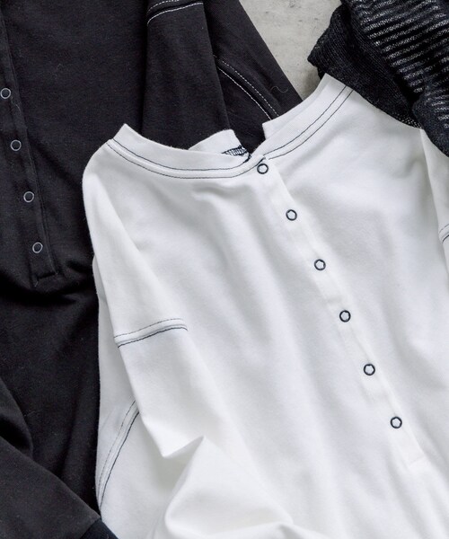 ピュアルセシン 2022 spring collection【Loose andclassical】リラックス感のあるルーズな着こなしや、今シーズンらしいミニマムでユーティリティな要素と素朴かつ巧みなハンドクラフト的なものとの融合させたスタイリングの提案◇着回しが利く、コットン素材カットソー◇●デザイン前後で着用ができ、着回しが利く優秀インナー。片面はトレンドのリングボタン、もう片面はネックラインに浅くV字の切り込みを入れ、落ち感のあるデザインに仕上げました。レイヤードにもメイン着にも使える丁度良い生地感なので長いシーズン、コーディネートに取り入れることができます。ワードローブにあると安心の1枚です。●カラー展開オフホワイト/ブラック/ボーダーの3色展開●素材コットンガーゼ生地を使用しているので、伸縮性があり柔らかな素材感です。●スタイリングコーディネートにプラスワンしやすいシンプルなデザインなので、ニットやスウェットとのレイヤードがオススメ。丁度良い生地の厚みなので、IN/OUTどちらも対応します。============================透け感:なし裏地:なし伸縮性:あり光沢感:なし生地の厚さ:普通【スタッフコメント】年齢:20代後半/身長:157cm/普段着用サイズ:Mサイズサイズ感:スタンダードなサイズ感。首周りは詰まり過ぎず、スッキリ見えました。素材感:サラッとしていて、柔らかなコットンガーゼ生地。伸縮性があり、おうち時間にもオススメです。===============================※撮影場所やお使いのモニター環境により若干お色味が異なる場合がございます。特にロケの撮影では明るく見える傾向にございます。※予約商品はサンプルで撮影をしております。若干の仕様が変更になる場合がございますので予めご了承の上ご注文くださいますようお願いいたします 。