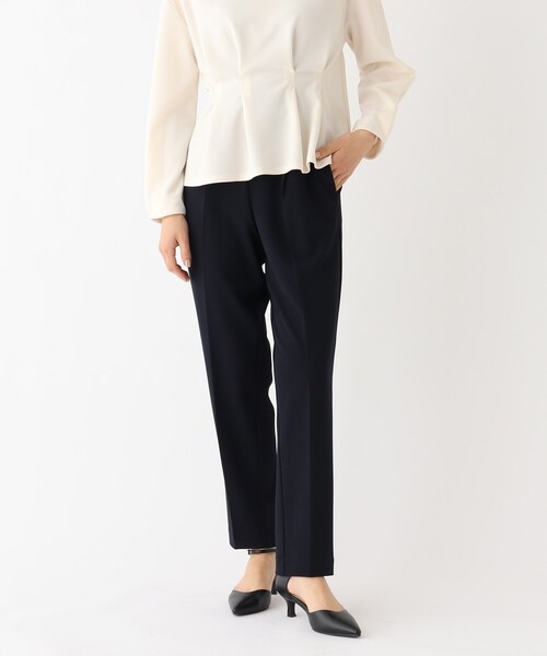 トレンドに左右されない、洗練されたシルエットが特徴。 イージーな着用感ときれい見えを両立するパンツ。 【素材】 伸縮性のあるジャージ素材”バウンシージョーゼット”を使用。 ふっくらとした肉感があり、肌寒い時期にもおすすめ。 柔らかな光沢感とハリのある表面感を兼ね備え、ストレッチの効いたリラクシーな着心地ながら、 しわになりにくいイージケアな素材で、いつでもきちんと見えが叶うindex定番の素材です。 ※オフホワイト(003)のみ膝丈裏地あり 【デザイン】 センタープレスの縦のラインとテーパードシルエットで履くだけでスタイルアップが叶うシルエット。 バックゴムウエストがフィット感と、リラクシーな履き心地を両立させてくれます。 シンプルなデザインはオフィススタイルにはもちろん、カジュアルなアイテムと合わせることで、デイリースタイルにも活躍します。 ※ポケット数:横×2 【こだわり】 42(LL)サイズはWEB限定サイズです。 ご自宅の洗濯機でお洗濯が可能です。 ※オフホワイト(003)はやや透け感があるため、インナーの着用をおすすめします。 こちらの商品は主に春に着用いただける商品です。 モデル情報:身長162cm B83 W60 H84 着用サイズ:38(M) 店舗へのお問い合わせ商品番号:C58-64002 ●製品寸法: 36(S):W68~76cm H82cm 股下67cm 前股上29cm 渡り幅27cm 裾幅15cm 38(M):W70~78cm H85cm 股下68cm 前股上30cm 渡り幅28cm 裾幅16cm 40(L):W72~80cm H88cm 股下69cm 前股上31cm 渡り幅29cm 裾幅17cm 42(LL):W74~82cm H90cm 股下70cm 前股上31cm 渡り幅31cm 裾幅19cm 備考: