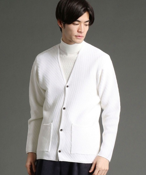 トレンド感のあるゆったりめのシルエットが特徴のカーディガンになります。表2本,裏1本で表現したバイヤスジャカードは,しっかりとした度目感でシャリ味のあるやや硬めの風合いが特徴。微配色で派手さを抑えながらも存在感のある編地で大人っぽく上品な仕上がりになっています。着用感もアクリル/コットンの為,チクチク感の無い快適な着心地となっています。