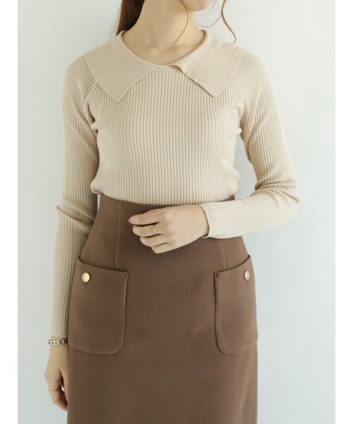 今季トレンドのフラットカラーがアクセントのニット。バックのラウンドカットされたカラー仕様も可愛らしさをアピール。伸縮性のある程よいフィット感がボディラインをキレイに見せてくれます。レギュラー丈なので、ボトムスを選ばず幅広いスタイリングが楽しめるのも魅力的。一枚で主役級になれる旬度高めなアイテムです。