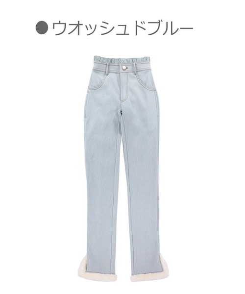 ハイウエストで履く冬のスリム見えパンツ こなれ感+足長効果+暖かいのいいとこ取り ウエスト部分にminiフリルで華奢感アピール パンツラインのほど良い広がり具合で 足の曲線を修正しつつ窮屈感なく着用できる もこもこファーで作ったハート型後ろポケットと 浅めサイドスリットがよりシーズン感を強調 スリムに見えてしっかり裏起毛だから 冬になると重宝する1枚になるよ 「ウォッシュドブルー」と「ベビーピンク」の2色展開