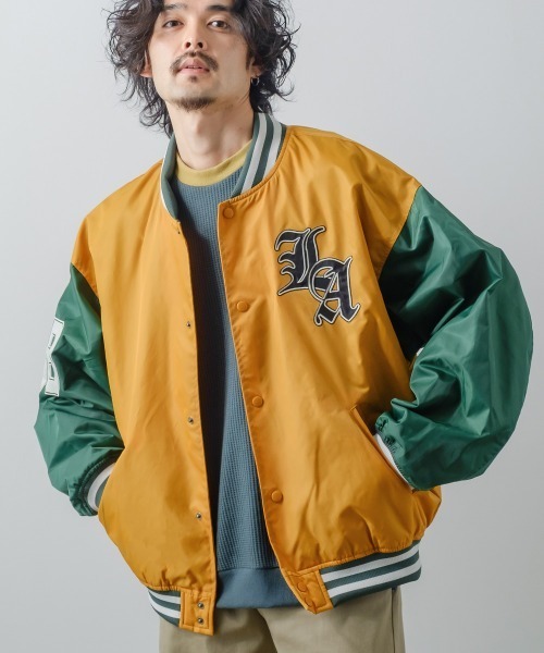 今期アウターの中で絶対的な存在となるスタジャンが今アツい●ラインリブに、刺繍ワッペン使いのナンバリングとLAのカレッジロゴがインパクト抜群のスタジアムジャンパー●微光沢のあるタフナイロン素材がストリートスタイルやスポーツスタイルと好相性●裏トリコットによって動きやすく、また、空気も含みやすいから保温&通気性もイイ●フロントスナップボタン●身頃スリットポケット×2、内ポケット×1●ダボっとしたオーバーサイズのビッグシルエット設計●男女共用、ユニセックスで着用可能なデザイン着るだけでスタイリングが決まるから合わせは無地のTシャツやスウェットで十分。スタジアムジャケットを際立たせるシンプルな着こなしにまとめたい◎ボトムもデニムやチノなどの定番アメカジアイテムとの相性の良さは勿論のこと、スウェットパンツやトラックパンツと合わせるのもお勧め。