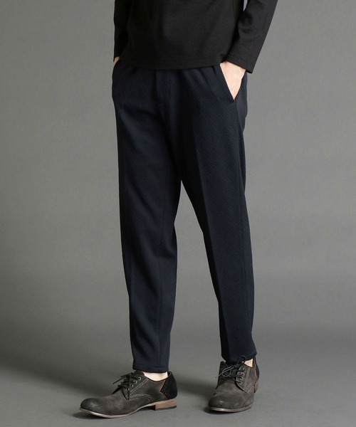 凹凸のあるジャカード生地を使用したイージーパンツ。ベルトループ付きですが、ドローコードを裏側に通しているのでベルトレスも、ベルトを付けたスタイリングも楽しんで頂けます。腰回りにゆとりを出しながらテーパードした綺麗なシルエット、伸びを活かした縫製仕様にする事で穿き心地を良くしています。表地には凹凸のある変形組織のジャカード生地を使用。膨らみのあるはっきりとした柄感、カットソーならではの高い伸縮性がありながら仕立て映えするしっかりとした張り感があるのが特長。同素材でジャケットも展開しているのでセットアップでのスタイリングが可能です。