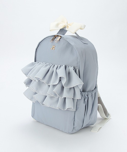 やわらかさのあるシフォンのフリルやチェリーチャームを添えたリュックです。 可愛らしいディテールをふんだんに取り込み、デザイン性をアップ。さらにマチも大きい設定なので、見た目よりも収納力は抜群です。背中部分は通気性の良いメッシュ素材で、汗をかいてもしっかり吸い取ってくれます。≪重さ≫M/約230g