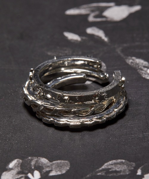 3個セットのリングです。 星やロープをモチーフにした柄の異なるリングを組み合わせたデザインとなっております。 口が開いたフォークリング仕様になっておりますのでフリーサイズで着用できます。 飽きのこないデザインで他のアクセサリーとの相性もよくスタイルのアクセントになります。