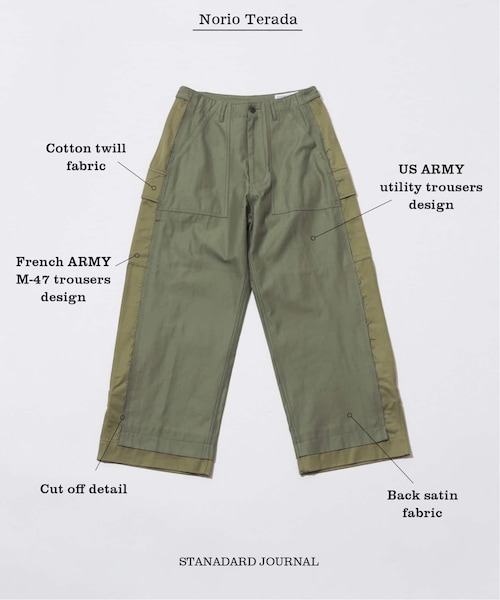 JOURNAL STANDARDのスタンダードを定義するレーベル、「STANDARD JOURNAL」通称”SJ”(エスジェイ)寺田典夫氏デザインのMilitary Pants《素材》・前回よりも肉厚な素材にどちらも変更・メインの生地は双子仕様のバックサテン(ベイカーパンツ)・サイドの別布はコットンツイル(M-47前期)《デザイン》・USARMYUTILITYPANTSとFRENCHARMY M-47TROUSERSを掛け合わせたリメイクのようなデザイン・前後のバックサテン素材と、サイドのコットンツイルのコントラスト・パンツを繋ぎ合わせる部分は3本針ステッチ・釦はベイカー、M-47それぞれに合わせたものを使用企画からデザインまでSJチームと共作して生まれた”NEW STANDARD”な逸品です。【寺田典夫/YOKEデザイナー】文化服装学院デザイン専攻科卒業後、ドメスティックブランドやセレクトショップなど数社で企画・デザインや生産管理を経験した後、2018AWよりをスタートさせる。YOKEは”繋ぐ”という意味を持ち、今回のアイテム全てにその技法が落とし込まれている。【STANDARD JOURNAL / スタンダード ジャーナル】JOURNAL STANDARDが25周年を目前にする今、 自らのスタンダードを再定義するプロジェクトレーベル「STANDARD JOURNAL」「STANDARD JOURNAL」の商品は、ひと月にゲストとして迎えられた4人のデザイナーやクリエイターたちが、予め決められたアイテムを「お題」として独自にデザインしJOURNAL STANDARDと共作で商品を製作。総勢30名以上のデザイナーが参加するこのプロジェクト、2021年より毎月発売されます。※商品の色味につきまして、お客様のお使いのPCのモニター環境により実際のカラーと画像の色味が違って見える場合が御座います。予めご了承の上、ご注文下さい。※店頭・外での撮影画像は光の加減で、実際の商品より明るく見える場合が御座います。※商品の色味はスタジオ撮影(*生地に寄った画像)を参考にして下さい。【注意事項】・サイズ表記はあくまで目安となります。・商品不備があった際は代替えのご用意ができない場合がございます。その場合ご返金のみの対応とさせていただきます。予めご了承下さい。モデルサイズ:身長:177cm 着用サイズ:L