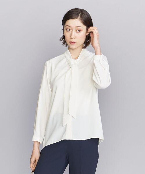 コーディネートを品よく仕上げる、ジョーゼットタイブラウス。 ■デザイン ミニマルなハイネックにボウタイデザインがクラシカルな印象のブラウス。 とろみのあるしなやかな素材が生み出すドレープが、女性らしい上品な佇まいを漂わせます。 ■素材 落ち感のあるポリエステルジョーゼット生地でお作りしました。 ■コーディネート 程よく存在感を発揮するルックスはジャケットのインナーとしてもおすすめ。 テーパードパンツやタイトスカートといった正統派ボトムとの相性も抜群です。 デイリーから通勤スタイルまで、幅広いシーンにマッチするアイテムです。 ============================ 裏地:なし 透け感:ややあり 生地の伸び:なし 光沢感:なし ケア方法:手洗い可能 ============================ 【注意事項】 ※商品を使用前に、タグ等に記載されている「取り扱い上の注意書き」、「洗濯表示」を必ずご確認ください。 ※商品画像は、光の当たり具合やパソコンなどの閲覧環境により、実際の色味と異なって見える場合がございます。予めご了承ください。 ※商品の色味の目安は、商品単体の画像をご参照ください。 店舗へお問い合わせの際は、全国のBEAUTY & YOUTH各店舗まで下記の品名/品番をお申し付け下さい。 品名:BN E/GGT TIE BL 品番:1611-162-2283