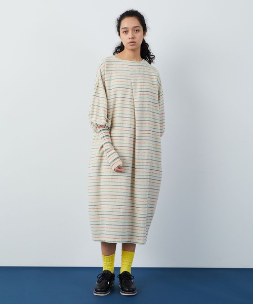 テレビ着用アイテム ザックリとした綿麻の生地は横にカラーの糸を束ねて繊細に織り込ませたオリジナルのマルチボーダー柄。 カラーの糸はあえて撚り(ひねり)をゆるくする事で均一な見え方ではなく、立体感のあるクラフトタッチのラフな仕上がりに仕上げています。 そんな素材を贅沢に使いゆったりとしたコークーンシルエットが特徴のワンピース。 衿もとはスッキリとしたクルーネックに仕上げ、フロントに大きなタックを取る事で立体感と体のシルエットを拾い難くしています。 袖にたっぷりと分量を持たせ、カラフルな編み地のニットでくしゅっとすぼませる事でルーズ過ぎないスッキリとした袖まわりを表現しています。 後ろ開きの下にもタックを取りアクセントをつけ、より丸さが際立つような仕上がりにしています。 繊細な素材や編み地のため、お洗濯の際はネットに入れ手洗いモードで優しく洗って下さい。 【ブランド情報】 FRAPBOIS/フラボア 2001年にブランドスタート。 「大人げない大人の服」をコンセプトに、大人が着るリラックスしたデイリーウェアを提案するコレクションブランド。 レディースとメンズのアイテムをご用意しています。 ---------------------------------------------------------------------- 【お気に入り登録】がおすすめです。 ■商品のお気に入り登録 再入荷、残り1点、セールなどの通知を受け取ることができます。 →商品ページ ♡ をクリック ■ショップのお気に入り登録 新商品や再入荷、セール、クーポン配布、ショップニュースなど、いち早くショップの情報を受け取ることができます。 →「♡お気に入りショップに追加」 をクリック ----------------------------------------------------------------------