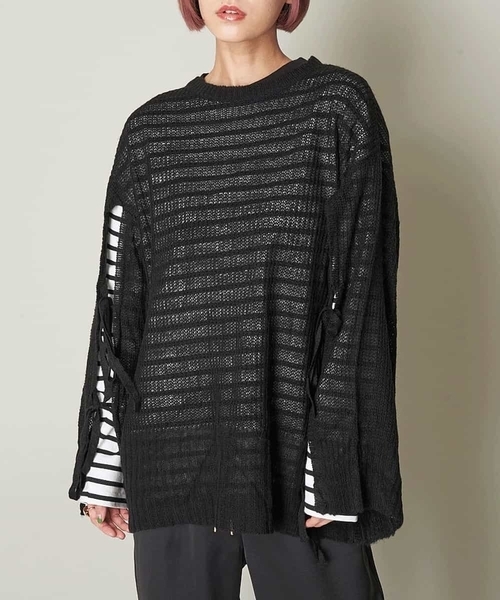 【デザインポイント】春夏に引き続き今季人気のメッシュニット!袖のレースアップが他にないこだわりのデザインポイントです。【着用コメント】丈が長めで全体的にゆったりとしたサイズ感。ふわっとした素材感なので軽くて快適な着心地です。【スタイリング】フォトTやロゴTとの重ね着が今年らしくおすすめ。タンクトップやキャミソールをインナーに着ても抜け感のあるスタイリングが楽しめます。
