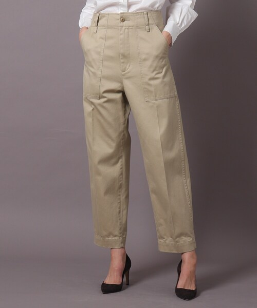 【カジュアルなパンツこそシルエットにこだわって】<商品説明>スッキリしたシルエット、ディテールをもったベイカーパンツです。高密度素材に製品での後加工を入れる事で、肌馴染みの良いソフトな履き心地に仕上げております。丸みを抑えた腰回りのラインをつくり、股上を少し深めにとっている為、 ベルトをしてジャストウエストで着用 大きめサイズで腰履きでの着用と、2通りの着方を楽しめるようになっています。ベルト通しが2か所あるので、通常のベルト通しにベルトをしたスタイルから、細いベルトをベルトループ下の細いループに通して着用いただくなど、ポイントの作り方に遊びの持てるパンツです。<素材説明>丈夫で光沢にも富んだコットンウェポン素材を使用し、製品に仕立ててからその固さを抜く為の後加工を入れました。しっかりと高密度に織り上げられた光沢感を持つ生地に製品で後加工する事で、表面の微起毛なタッチと、生地の腰が少し抜けソフトになったヴィンテージのような風合いを再現してます。<着こなし・スタイリングのおすすめなど>シルエットのあるトップスをウエストインし、ベルトをしたキレイなスタイリングがおススメです。サイズをジャストサイズでなくあえてワンサイズ上のものをお選びいただいて、腰で穿いていただくスタイルや、ベルトでクシュっとして着用頂くスタイルもおすすめです。※ポケット数:横×2 後ろ×2※裏地なし※ライトベージュ(051)はやや透け感があるため、インナーの着用をおすすめします。こちらの商品は主に春に着用いただける商品です。モデル情報:身長163cm B80 W60 H88 着用サイズ:38(M)店舗へのお問い合わせ商品番号:085-64013●製品寸法:34(SS):W65cm H90cm 股下64cm 前股上32cm36(S):W68cm H93cm 股下65cm 前股上32cm38(M):W71cm H96cm 股下66cm 前股上33cm40(L):W74cm H99cm 股下67cm 前股上33cm備考: