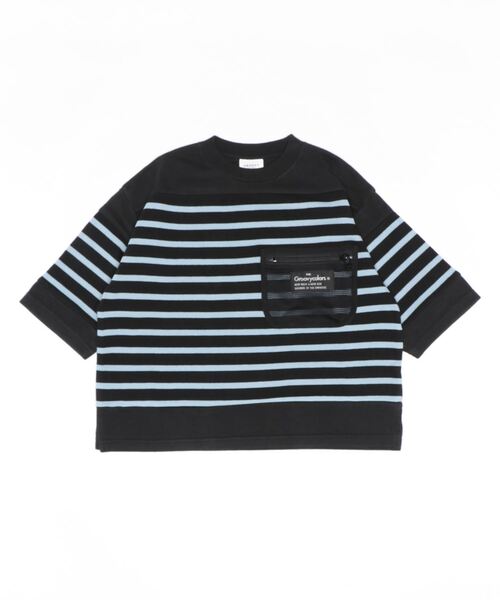 厚手でしっかりとした天竺ボーダーと無地の切替Tシャツ。 身幅が広く、肩落ちして肘が隠れるくらい袖も長めのBIGシルエットで、リラックスして着用出来るアイテム。 左胸に大きめのメッシュ素材の胸ポケットがアクセントに。