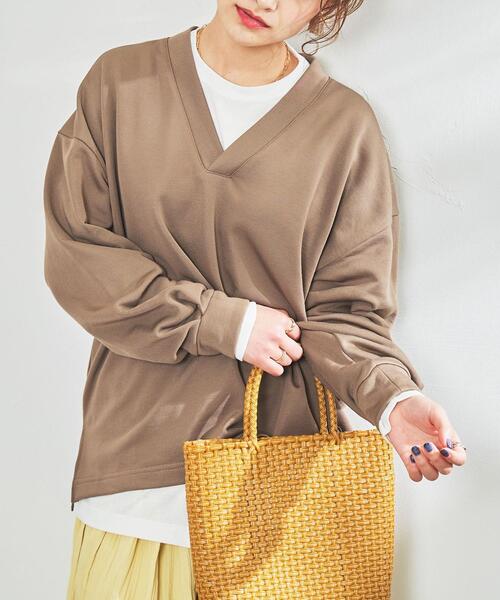 ~2022 SPRING/SUMMER COLLECTION~人気のキレイ目スウェット2SETの新作■デザインロングスリーブTシャツに、深いVネックスウェットプルオーバーをレイヤードできる2セット。どちらも適度なサイズとシンプルなデザインで、それぞれ単品使いにも重宝するアイテムです。スウェットにはサイドスリットを施して、こなれ感を出しています。■素材裏毛ですが、キレイ見えの生地を使用しているので大人の方にもおすすめできる一枚。インナーのロンTも肌触りのよいソフトなコットンを使用しています。■スタイリング一枚完結型のデザインなので、気負いせずスタイリングできる嬉しいアイテムです。ボトムはどんなものともバランス良く合わせて頂けます。Vネックスウェットはお手持ちのカットソーやシャツとのレイヤードもお楽しみください。透け感:Tシャツはあり生地の厚さ:Tシャツは薄手、スウェットは普通光沢感:なし裏地:なし家庭洗濯:可能(ネット使用)【スタッフ着用コメント】伸長:160㎝ 体型:普通 普段着用サイズ:M 試着サイズ:Lサイズ感:大き目で着たくてLサイズ着用。ゆったりしていて、お尻まで隠れる丈感です!素材感:ロンTは肌触りも良く柔らかいです!スウェットも裏毛ですがさらっと着れて綺麗めにも着ていただきやすいです。【注意点】※撮影商品はサンプルの為、実際の仕様と異なる場合がございます。※画像の商品は光の照射や角度、お使いのモニター環境により、実物と色味が異なる場合がございます。スタジオ物撮りの画像が実物の色味に一番近くなっております。※予約商品の場合、お届け予定はあくまでも目安となります。生産の都合上、お届け時期が前後したり実店舗入荷時期とずれる場合がございますので、あらかじめご了承ください。品名:キレイメウラケ フカV & ロンT セット 品番:7620-621-0259