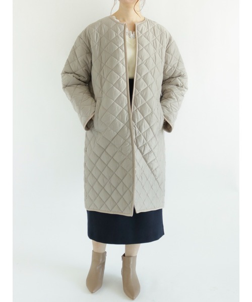 トレンドライクなキルティングノーカラーコート。 防寒性が高く風を通しにくいので体温を外に逃がしにくいにが魅力的◎ ノーカラーなのでマフラーなどで首元にアイテムを持ってきてもスマートに決まります! 中に沢山着こめるのでこの冬おすすめです◎
