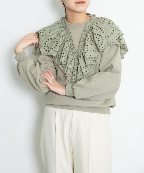 【フリル使いで存在感を引き上げたレディライクなスウェット】 スウェットと同色のフリルをあしらって女性らしい表情に仕上げた1着。ベーシックなカラー展開で甘さを抑えているのもポイント。生地の厚みも程良く、アウターインでも着膨れしにくいので寒い時期から春まで長くお楽しみいただけます。 POINT ・フリルをあしらうことで存在感アップ ・合わせやすいベーシックなカラーリング ・1枚でもアウターインでも着映えするデザイン COORDINATE 女性らしいデザインなのでデニムを合わせてもカジュアルになり過ぎず、大人っぽく仕上がります。カラーボトムを合わせるとより今っぽい印象に。 ※商品画像は、光の当たり具合やパソコンなどの閲覧環境により、実際の色味と異なって見える場合がございます。予めご了承ください。 ※商品の色味の目安は、商品単体の画像をご参照ください。 ▼お気に入り登録のおすすめ▼ お気に入り登録商品は、マイページにて現在の価格情報や在庫状況の確認が可能です。 お買い物リストの管理に是非ご利用下さい。素材感 透け感:なし 伸縮性:ややあり 裏地:なし 光沢:なし ポケット:なし One