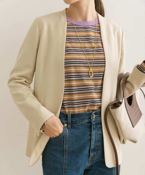 【新生活やオケージョンなどで活躍必須のジャケットが登場】 オケージョンシーズンを目前にURBAN RESEARCHからオンオフ兼用で活躍する綺麗めジャケットをご用意しました。ツイル地の梳毛調合繊でナチュラルなストレッチ感があり、見た目以上の動きやすさがあります。かっちりしすぎないよう釦レスでお作りしているので、デニムやカジュアルなアイテムのハズシとしてもおすすめ。シンプルなノーカラージャケットは普段使いだけでなく、入卒園式やパーティーシーン等でも活躍するので一つ持っておくと重宝すること間違いなしの一点です。 POINT ・同素材のタックストレートパンツ(UR24-24F004)とセットアップで着用可能 ・シーズンレスでお召し頂ける素材・色味でご用意 ・身長や体型に合わせて選べる2サイズ展開 COORDINATE オフィスやオケージョン向けのアイテムなので、セットアップでのスタイリングがおすすめ。普段使い用としてお召頂く際はロンTやボーダーTの上に羽織るなどカジュアルアイテムに1点投入しても◎ 【体型別スタッフ着用レビュー】 《 身長:152cm/体型:細身/着用サイズ:36 》 コンパクトなシルエットでジャケットでも着られている感がなくぴったりのサイズ感でした。ストレッチの効いた素材で見た目以上に楽な着心地です。 《 身長:157cm/体型:普通/着用サイズ:38 》 普段トップスやアウターは36サイズを着用することが多いですが、こちらのジャケットは細身のシルエットなので38サイズを着用しました。 よりすっきり着たい方は36サイズ、少しゆとりが欲しい方は38サイズが良さそうです。 ※この商品は、摩擦(特に湿った状態での摩擦)や、汗、雨などで濡れると、他の衣料や下着(特に白物)に色移りする場合がありますので、充分ご注意ください。 ※洗濯で多少色落ちすることがありますので、できるだけ単品洗いをお勧めします。 ※その他お取り扱いに関しましては、商品に付属のアテンションタグをご覧ください。 総重量 : 約450g ※商品画像は、光の当たり具合やパソコンなどの閲覧環境により、実際の色味と異なって見える場合がございます。予めご了承ください。 ※商品の色味の目安は、商品単体の画像をご参照ください。 ----------------------------- 透け感:なし 伸縮性:なし 裏地:あり 光沢:なし ポケット:あり -----------------------------