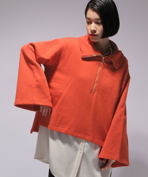 ーーー大きい襟がポイントのジップハイネックスウェット。ーーー裏毛生地を使用し、通気性が良く、柔らかく履き心地抜群のアイテム。大きめのワイドシルエットでメンズライクにラフに着用して頂けます。ジップを閉めると高めのハイネックで着用でき、開けるとビッグカラーに見えるデザインに。袖は太めのフレアスリーブで作成し、女性らしさもプラスしました。秋から春まで着やすく、シンプルなデザインの為、カジュアルなデニムなどのアイテムから、綺麗めなフレアスカートとの相性もバッチリです◎※撮影環境により、光の当たり具合で 色味が違って見える場合があります。 あらかじめご了承下さい。