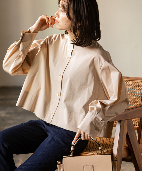 【2022SS】 NOBLE マニッシュさを残しつつも、女性らしい着こなしがアップするシャツが登場! オーガニックコットンのストレッチブロードを使用し、ハリ感と光沢感にサラリとした肌触りが加わった一着。 ショートレングスとワイドボディ、ボリュームスリーブ、コンパクトに見せるハンドカラーとこだわりのデザインが目白押し! 袖口のアジャストのボタンはあえて広めのまま着こなせば、抜け感もしっかりと感じられます。 ボタンを開けてショートジャケットのような着こなしも出来るので、一枚着でも羽織りとしても様々な着こなしを楽しんで。 ********************** 透け感:なし(ベージュ、ネイビー)・あり(ブラック) 裏地:なし 伸縮性:なし 光沢感:ややあり 生地の厚さ:普通 ********************** 【スタッフ着用コメント】 年齢30代/身長:165cm/体型:普通/普段サイズ: 38 /着用サイズ:フリー サイズ感:やや肩の落ちたゆるっとしたサイズ感。見頃はボックスの様なシルエットです。着丈はヒップ上くらいなので羽織るだけでバランスよく着こなせます。 素材感: ハリ感と光沢感があり、ドライタッチな軽い素材。 着心地: サラリとしていますが、すっきりとしたボックスラインですっきり見えが叶います。 ********************** ※ネイビーのみ 色落ち:摩擦、濡れによる色移りに気をつけてください。 ※取り扱いについては、商品についている品質表示でご確認ください。 ※こちらの商品は、NOBLEでの取り扱いになります。 直接店舗へお問い合わせの際はNOBLE店舗へお願い致します。 ※照明の関係により、実際よりも色味が違って見える場合があります。 またパソコン・スマートフォンなどの環境により、若干製品と画像のカラーが異なる場合もございます。予めご了承ください。 ホワイト着用スタッフ身長:163cm 着用サイズ: フリー ベージュ着用スタッフ身長:158cm 着用サイズ: フリー ネイビー着用スタッフ身長:164cm 着用サイズ: フリー モデルサイズ:身長:165cm 着用サイズ:フリー 本体:手洗い可能