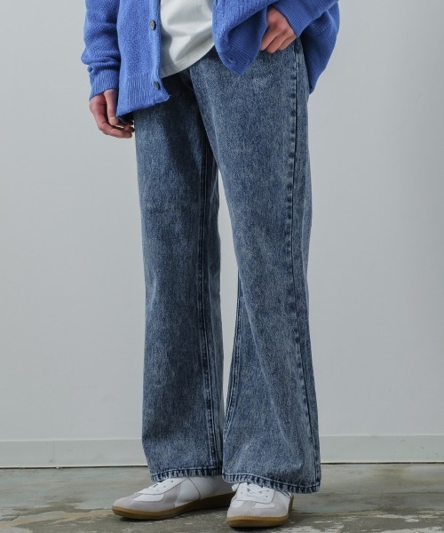 古着系ファッションで再注目されているケミカルウォッシュフレアデニムパンツ●ワイドパンツのネクストブレイクとして人気を集めるフレアパンツ●足先に向けて裾が広がってゆくことで美脚効果があり、太ももを細く見せてくれる効果もあるので着痩せ面でも優秀●ハリのあるしっかりとした生地感ながら、柔らかさも持ち合わせるから穿き心地も◎●シワになりにくいイージーケアな部分も魅力のひとつケミカルウォッシュ×フレアカットのクラシックさが魅せる最強タッグ。すらっと穿きこなしてスタイルアップしたい一本。足元はスニーカーからレザーシューズまで多様に合わせやすく、白Tシャツをタックイン、ニットカーディガンをさらっと羽織るなどカジュアルなスタイリングと好相性。