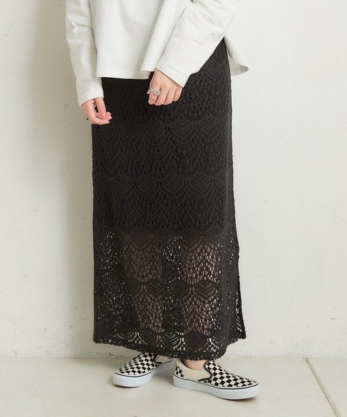 ■アイテム 贅沢にあしらったレース編みデザインが魅力のIラインスカート。 程よく透けるレッグライン、スリットがスタイリングに抜け感をプラスしてくれます。 裏地が膝あたりまでついているので露出を抑えられ、安心して着用いただけます。 リラックス感のある履き心地で、お出かけにはもちろん、お家でくつろぎたい日にもピッタリなアイテム。 ベーシックに使えるホワイト、ブラックに加え春先まで使えるトレンドのグリーンの3色展開です。 ■素材 しわになりにくいアイテムなので、お家でのお手入れが簡単です。 表面感のあるレース生地が、いつものスタイリングに鮮度をプラスしてくれます。 ■スタイリング シンプルなカットソーと合わせるだけで、オシャレにきまります。 ワンピースやチュニックとレイヤードして、裾から覗かせる着こなしもおすすめです。 カレッジTeeや、ミリタリーベストに合わせると、程よくカジュアルダウンして着て頂けます。 気になった商品はお気に入り登録がオススメです! 入荷情報や、クーポン情報が通知されるようになります。 ※画像の商品はサンプルです。 実際の商品と仕様、加工、サイズ、素材が若干異なる場合がございます。