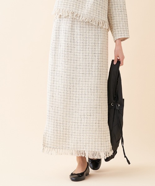 << POINT >> ■上品見えツイード×フリンジディテール 上品な風合いが大人の女性らしいツイード生地のタイトスカートに、ヌケ感のあるフリンジディテールをプラス。 ■深めのサイドスリットで足さばきも◎ ロング丈ですがサイドスリットを深めに入れているので動きやすいです。 ■後ろゴムでストレスフリーな穿き心地 フロントはすっきりと、バックは伸縮性抜群のゴムを入れています。 ■カジュアルにもオケージョンにも着用可能なアイテム ニットやカットソーと合わせてカジュアルに、セットアップ対応のブラウス(メーカー品番:6200208)やジャケットと合わせてオフィスシーンやオケージョンニーズに。 同シリーズ品番:6200208(ツイードブラウス) <********** 着用シーズン:初春~春 ケア方法:ドライクリーニング 生地の伸縮性:なし 生地の厚さ:普通 透け感:なし 裏地:あり ポケット:なし ウエスト:後ろゴムあり ********** ※定価(税込)は、2022年06月24日のセール開始前の店舗における販売価格です。 2:ウエスト72、ヒップ94、総丈88