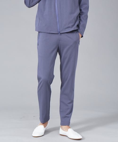 【素材】通年使えるストレッチの効くジャージー素材。レーヨンによりやや光沢がかっているので綺麗な印象で着ていただけます。また、ナイロン混のためストレッチが効きつつも生地の強度もしっかり確保されています。【デザイン】テーパードがかったスリムシルエットのトラックパンツです。余計なデザインを付けず、ミニマルな印象にしております。シルエットは足のラインを綺麗にみせるシルエットに仕立てています。【コーディネート】スポーティな印象を活かしてブルゾンやパーカなどと合わせてカジュアルコーデがおすすめ。さらに、コートやレザーライダースと合わせて綺麗目なコーデの外しアイテムとしても使えます。同素材のセミダブルライダース型ブルゾンもございますので、セットアップとしてもお楽しみいただけます。【同素材】セミダブルライダース品番:00446030001