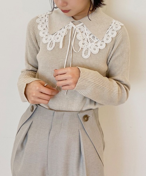 襟付きニットにレース衿のSETリブデザインニット。 【素材】 ナイロン混の肌触りの良い、やわらかくしっかりした肉感が特徴的な糸を使用しています。 まだ肌寒い、今の時期から着て頂けるリブ編みの春先取りニット。 レース衿は合繊のしっかりした素材感でおつくりしているので、かわいくなりすぎず◎ 【シルエット】 身頃はしっかりと肉感のでるリブ編みデザインで、すっきりとした印象に仕上げました。 衿部分に合わせてレース衿をお作りしているので、合わせたときにちらっとみえる仕様に◎ アウターにもひびかないシルエットですっきりと着用して頂けます。 【こだわり】 一枚で衿デザインニットとしても着用できる、着回し力の高いSET商品。 レース衿は他のお持ちのニットに合わせて頂いても◎ マシンウォッシャブル機能つき。 ※製品寸法は平置きのスペックとなっております。こちらの商品は伸縮性があります。 こちらの商品は主に春に着用いただける商品です。 モデル情報:身長162cm B83 W60 H84 着用サイズ:38(M) 店舗へのお問い合わせ商品番号:N02-14004 ●製品寸法: 38(M):着丈55cm B78cm 袖丈58cm 肩幅34cm 付属襟内周46cm 付属襟幅12cm 備考: