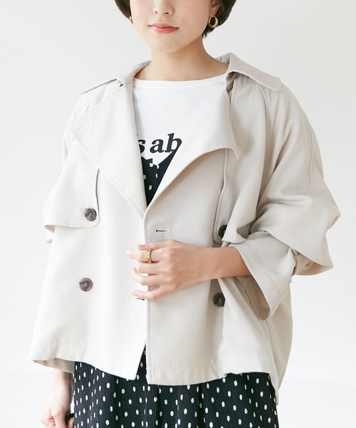 【2022SS】ニュアンスのあるカラーリングで、今年らしい着こなしが叶うショートトレンチコート。しっとりとやわらかなツイルピーチ素材を使用しており、女性らしさを感じる生地感です。袖口はスナップボタン留めで2段階調整可能、バックヘムにはゴムを施し、女性らしいシルエットを演出。ワイドパンツなどでトラッド風のスタイリングはもちろん、ワンピースと合わせて大人フェミニンな装いにまとめるのも◎ブルゾンとはまた違う雰囲気で大人っぽく着こなせるおすすめの一着。*豊富なマルチサイズ展開(M/L/LL/3L)*大きいサイズ対応*洗える<INCEDE>■商品注意事項■※商品画像は、光の当たり具合やパソコンなどの閲覧環境により、実際の色味と異なって見える場合がございます。予めご了承ください。※末永く愛用頂く為に、アテンションタグ・洗濯ネームを必ずご確認の上、着用又はお取り扱い下さい。※生産時期により色味が多少異なる場合がございます。予めご了承ください。