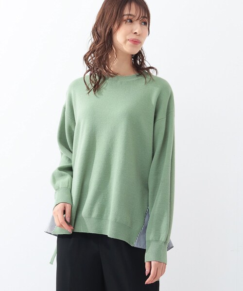 ■デザインサイドスリットニット×シャツがドッキングされた今年らしい人気の一枚です。コーデ映え間違いなしの、着るだけで完成する嬉しいアイテムです。サイドのリボンは自由に結んで頂けたりと、細部にお洒落な抜け感がポイントです。布帛のシャツ部分は、全色ネイビーストライプ柄です。■生地感もっちりと柔らかなニットと、サラリとドライな質感の布帛地を切り替えた異素材MIXが新鮮です。※オフホワイト(003)は透け感があるため、インナーの着用をおすすめします。■サイズ大きいサイズ(LL)の展開あり。※04(LL)サイズはWEB限定サイズです。■スタッフ着用コメント薄手のニットは春本番の頃に大活躍しそうです!サイドのストライプ切り替えがポイントになり、1枚でコーデがきまります。こちらの商品は主に春に着用いただける商品です。モデル情報:身長168cm B78 W58 H84 着用サイズ:02(M)店舗へのお問い合わせ商品番号:741-14008●製品寸法:02(M):着丈60cm B116cm 袖丈50cm 肩幅50cm03(L):着丈62cm B120cm 袖丈51cm 肩幅52cm04(LL):着丈63cm B124cm 袖丈51cm 肩幅53cm備考: