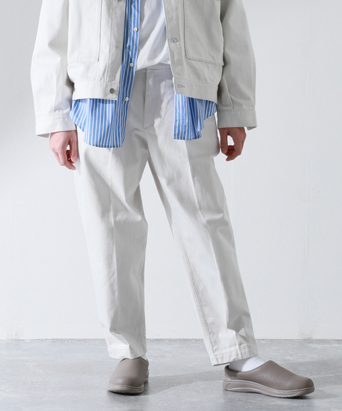 ワイドシルエットの12ozデニムワイドスラックスが登場。サイズ感はワイドシルエットで特に腰回りはゆったりとしたサイジング。デニム生地であえてスラックス面に仕上げているので、カジュアルなイメージが強いデニムパンツでもこのアイテムはきれいめでも、カジュアルでも幅広いコーディネートに合わせていただくことができます。生地感もワンウォッシュで仕上げているので、スッキリとした見た目になっています。※同素材のデニムトラッカージャケットもオススメです!品番:「22011464000010」商品名:「DENIM トラッカージャケット」**********************裏地:あり伸縮性:なし光沢感:なし生地の厚さ:普通**********************【スタッフ着用コメント】《スタッフH》身長:170cm/体重:60kg/体型:中肉中背/普段サイズ:M/着用サイズ:Lサイズ感:腰回り、太もも回りがゆったりとしているサイズ感です。素材感:12ozですが、ワンウォッシュ仕上げなので柔らかい印象の素材感です。着心地:サイズ感・素材感ともに楽に着ることができます。**********************※店頭・外での撮影画像は、光の当たり具合で色味が違って見える場合があります。商品の色味は、スタジオ撮影の画像をご参照ください。モデルサイズ:身長:178cm 着用サイズ:L本体:洗濯機洗い(弱)、製品洗い、色あせ