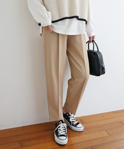 伸縮性のあるカットソー「ポンチ素材」を使用した 《動ける!楽ちんキレイめウェア》 新作テーパードパンツが入荷しました。 表面にほんのり凹凸感のある 梨地ジョーゼットを採用。 伸縮性があり、裏面は滑らかな手触りが心地よく、 カットソーながらも"キレイ見え"する 素材を厳選しました。 少し厚手でシワになりにくく、 しなやかな落ち感がキレイめコーデにも◎ シーズン問わず着られて、 お家で洗えるのも嬉しいポイントです♪ ややハイウエストで、少しゆったりと仕上げた トレンド感のあるシルエット。 センタープレスを美しくキープしてくれる ピンタックにこだわりました。 サイドポケットあり。 バックポケットはフェイク仕様ですっきりと。 ウエスト後部はゴム入りで着脱も楽ちんです♪ オケージョンやオフィスウェアとしてはもちろん、 ストレッチが効いており、テレワークや ご近所ウエアとしても重宝する1枚です。 セットアップでの着用はもちろん、 スニーカーで着くずしたカジュアルコーデにも使える♪ オン・オフ問わず着まわせる! 春~秋まで3シーズン使える、当店デザイナーの こだわりが詰まったオススメitemです。 裏地なし ※撮影時のライティング、ご覧になっているモニター・PC環境により 実際の商品と色味が異なって見える場合がございます。 ご了承の上お買い求め下さい。 素材: ポリエステル97% ポリウレタン3% ≪備考≫ 伸縮性:あり 透け感:なし 生地の厚さ:やや薄手 肌ざわり:さらっとしている その他:梨地ジョーゼット・ポンチ素材 表面にシボ感・凹凸感あり 生産地:中国 洗濯機:可 ドライクリーニング:可