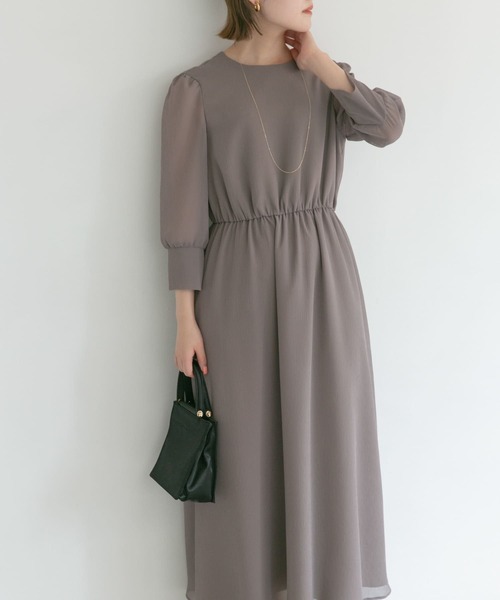【バックデザインがサマになるロングワンピース】程良く透け感のある楊柳シフォンを使用したワンピース。身頃部分は裏地がついているので、透け感やインナーを気にせず着用して頂けます。ウエストは総ゴムで締め付けが少なく、ストレスフリーな着心地が魅力。バックのゴールド釦がアクセントとなり、結婚式などのパーティーにはもちろん、フォーマルシーンにもぴったりな一着です。※商品画像は、光の当たり具合やパソコンなどの閲覧環境により、実際の色味と異なって見える場合がございます。予めご了承ください。※商品の色味の目安は、商品単体の画像をご参照ください。-----------------------------透け感 : あり(袖のみ)伸縮性 : なし裏地 : あり光沢 : なしポケット : なし-----------------------------