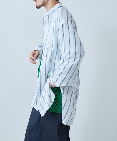 Lui's(ルイス)オリジナル22SSコレクションより、高級感ある素材感と独特なデザインが特徴的な『バンブーレーヨンシャツシリーズ』から春夏限定のスタンドカラーストライプシャツの登場です。フロントのスタンドカラーとロングテールのデザインが特徴的なアイテムです。 【素材】 素材には、竹の原料から抽出された再生繊維であるバンブーポリエステルサテンストレッチを使用。 吸水速乾性に優れており、柔らかい光沢感が特徴的です。 またヨコ糸にスパンデックスが使われているため、程よいドレープ感と、ストレッチ性が生み出す着心地の良さがあります。 【デザイン】 通常のシャツよりも丈感が長く、オーバーサイズのシルエット。 襟はスタンドカラーになっており、着て頂くとスッキリとした印象に。 また裾も特徴的で、フロントはラウンドカットでバックはスクエアカットになっており、前後で丈が違うデザインになっております。 袖と背中にそれぞれタックを施し、着用時に立体感のあるシルエットになるように作られています。 【コーディネート】 ロングな丈感が特徴的なアイテムなので、一枚で着て頂くのはもちろんジャケットやコートのインナーとして着て頂くのもオススメです。 また今季はTシャツの上から羽織ってライトアウターとして着て頂いたり、ニットベストと組み合わせてレイヤードスタイルを楽しんで頂くのもオススメです。 一枚で様々なコーディネートが出来る使い勝手の良いアイテムです! 【ブランド】 Lui's(ルイス) モテる男のワードローブをテーマにモード&ストリートのMIXコーディネートを提案。 着心地、カッティング、素材感を重視した商品を国内外問わず編集し発信していく。 ■商品のお気に入り登録(ハートマーク) 完売カラーの再入荷、ラスト1点の通知、セールの際の通知を受け取れます。 ■ブランドのお気に入り登録 新商品の入荷など、いち早くブランドのお得な情報を受け取れます。 是非ご利用ください。
