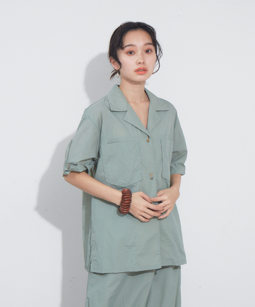 -Design- シャカっとしたナイロン素材が今年らしい開襟シャツ。 開けて羽織としても使い勝手のいい1枚。 -Detail- 薄手でハリ感のある素材で春夏の暖かい気候にも爽やかに着用頂けます。 Vネックでアクセサリーもほどよく見せれる開き具合で首も長く見えてスタイルアップ。 -Cordinate- 同素材のスカートとセットアップでコーデするが一番のおすすめ。 ボタンを開けてタンクトップと合せて着たり、カジュアルパンツとも良いバランスを作れます。 【注意事項】 洗濯ネット使用 /つけ置き禁止 /当て布使用 /この商品は光により変色や褐色しやすいので長時間光の当たるところでの保管はお避けください ※商品画像は、光の当たり具合やパソコンなどの閲覧環境により、実際の色味と異なって見える場合がございます。あらかじめご了承ください。 ※画像の商品はサンプルです。 ※商品の色味の目安は、商品単体の画像をご参照ください。 ※商品を使用前に、タグ等に記載されている「取り扱い上の注意書き」「洗濯表示」を必ずご確認ください。 ※商品に不良が無い場合、包装紙および箱の破損がございましても発送いたします。あらかじめご了承ください。 ※ご注文いただいた予約商品のお届け時期の確認は、注文履歴ページより行えます。 セージグリーン モデル:H161 B76 W60 H82 着用サイズ:Fオレンジ モデル:H161 B76 W60 H82 着用サイズ:Fパープル モデル:H165 B79 W61 H88 着用サイズ:Fブラック モデル:H165 B79 W61 H88 着用サイズ:F