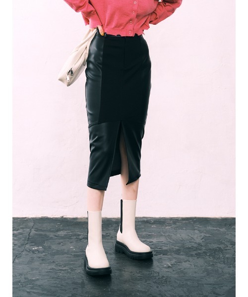 大人っぽい印象のミディアム丈のSKです。 フェイクレザーと伸縮性があるポンチ素材を組み合わせたエッジの効いた1着になっています。