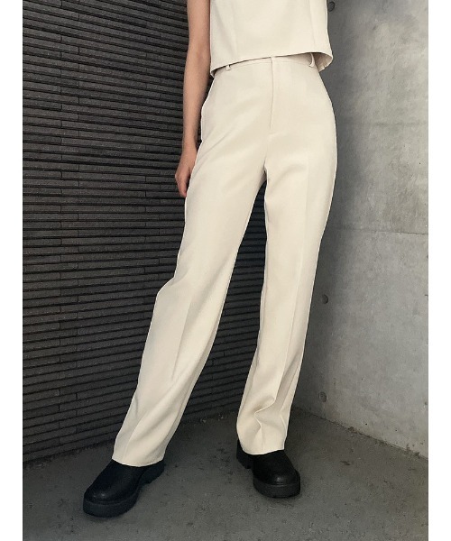ハイウエストで細身のシルエットが綺麗なPT。 センタープレスが入っているので大人っぽい印象になっています。 同素材のクロップドビスチェ(1221060051)とダブルブレストJK(1221030051)とSETUPでの着用がおすすめです。