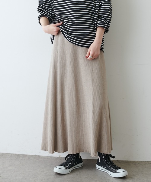 ピュアルセシン 2022 spring collection【Loose and classical】 ◇美シルエットなニットリブスカート◇ ●デザイン リラックス感のあるニットリブスカート。 編み立てによる成形なので脇線に縫い代がなく、 腰回りはスッキリとしつつも、歩くたびに裾に動きが付き女性らしいシルエットを作ります。 ウエストはゴムでリラクシーな穿き心地。 カジュアルにもレディライクにも着回せる優秀アイテムです。 ●カラー展開 オフ/ベージュ/ブラックの3色展開。 ●素材 柔らかく、伸縮性の高いニット素材。 程よく厚みがあり裏地もついているので、ショーツの透け感は気になりにくくなっています。 ●スタイリング ビッグシルエットのスウェットやチュニックはもちろん Tシャツをタックインするのもオススメ◎ スニーカーやバレエシューズからシーズンライクなブーツまで、様々なアイテムと相性抜群です。 =============================== 透け感:オフのみややあり 裏地:あり 伸縮性:あり 光沢感:なし 生地の厚さ:普通 【スタッフコメント】 年齢:20代前半/身長:152cm/普段着用サイズ:Mサイズ サイズ感:152cmでくるぶし程の丈感なので身長問わず着用できます。 素材感:柔らかくチクチク感はないニット素材。程よく厚みがあるので透け感は気にならなかったです。 =============================== ※撮影場所やお使いのモニター環境により若干お色味が異なる場合がございます。特にロケの撮影では明るく見える傾向にございます。 ※予約商品はサンプルで撮影をしております。若干の仕様が変更になる場合がございますので予めご了承の上ご注文くださいますようお願いいたします 。