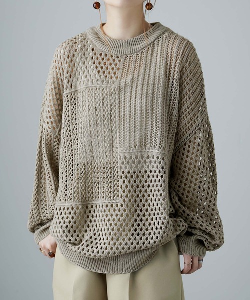 重ねやすく使いやすい、「ざっくりとしたブロッキングニット。」日常づかいしやすい編み目の大きなニットに、パターンの違うブロッキングデザインを合わせてこなれ感を足し算。新鮮味やムードをもたらす「透け素材。」体のラインを拾わないシルエット、重めな素材の抜け感づくりに最適、ルーズな編み目のニットならではのドライな風合いのおかげで、カジュアルダウンにもオススメです。・伸縮性あり・透け感あり【もっとお買い物を楽しんで頂く為に】▼商品のお気に入り登録お気に入りアイテムの値下げ・再入荷・在庫1点などの通知を受け取ることができます。▼ブランドのお気に入り登録新作アイテム入荷や人気商品の再入荷、タイムセールやクーポンなど、いち早く「bflat」のお得な情報を受け取ることができます。