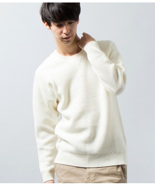 ガゼットワッフルクルーネックニット。ジュンレッド。【スウェットのようなデザインがアクセント】ワッフル編みを取り入れたクルーネックニットです。ベーシックなフォルムに、立体感のある編み地を使い表情を持たせました。襟元にはガゼットをあしらうなど、スウェットを踏襲したデザインになっています。ふんわりと肉厚なニットを使用しているので、保温性の高さもポイントです。