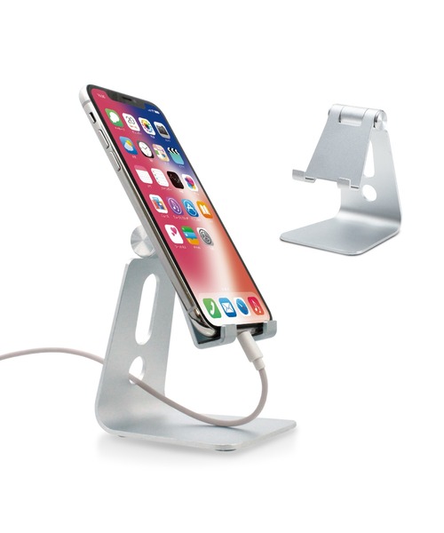 自由に角度調整ができ、設置しているスマートフォンに充電ケーブルを装着できる、フリーアングルスタイルのスマートフォン用アルミスタンドです。 ■インテリアになじむ、シンプルで美しく高級感のあるアルミ仕上げです。 ■およそ4.0~6.0インチのスマートフォンに対応しています。 ■ホルダー部は自由に角度調整ができるフリーアングルタイプで、Web閲覧や動画視聴などシーンに合わせてお好きな角度で使用できます。 ■ホルダー部の受け部分は中心が開いており充電ケーブルを接続しやすくしています。 ■ホルダー部は約10mmのマチ幅があるため薄いケースであれば装着したままスタンドに設置することができます。 ■スタンド底面には、滑りにくく安定して設置できるシリコンパーツが付いています。 ■スタンドアーム部のケーブルホールにケーブルを通すことができ、ケーブルがキレイに配置できます。外形寸法:幅:約74mm×奥行き:約103mm×高さ:約80mm 重量:約110g 対応機種:ディスプレイサイズが6.0インチ以下で厚みが12mm以下のスマートフォン、タブレットPC 角度調節:○