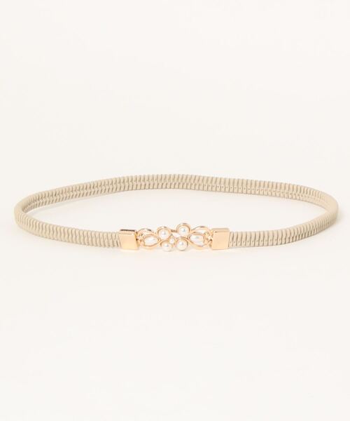 2022 春アイテム バックルにビジューをあしらったベルトでウエスト周りに華やかなアクセントをプラス。ゴールドカラーとフェイクレザーの組み合わせが大人レディな雰囲気です。引っかけるだけで簡単に着脱でき、細めなのでどんなスタイルにも合わせやすいのが◎。パンツはもちろん、ワンピースやロングシャツなどのウエストマークにもぴったりです。バックルはパールビジューをあしらったデザインや蝶モチーフなどがラインナップ。・合成皮革