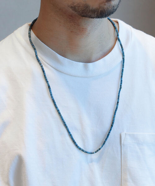 伝統的な染色をほどこしたネックレス 江戸時代から続く伝統的な染色方法で染め上げたシェルネックレス。「天然藍灰汁発酵建て」という大変手間ひまと労力のかかる染色方法で、化学薬品を一切使用せず藍の葉を発酵させて作る ″すくも″ の他、自然界からとれる原料のみを厳選。本物の美しさ、身に着ける人やさらには環境への配慮も備えた素晴らしい染色技法は、天然素材である貝殻とも相性がよく優しい雰囲気に仕上がっています。 Folk/N / フォークバイエヌ 世界中の伝統工芸品や民芸、トライバルに受け継がれてきた知恵や技術をインスピレーションに手仕事の温もりを感じることの出来るタイムレスなプロダクトを目指すブランド。