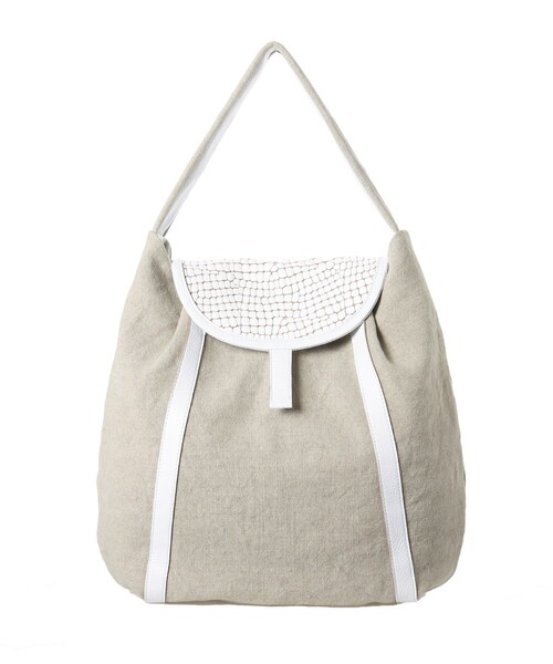 白いレザーと洗いをかけた麻素材と組み合わせた、春夏らしいワンショルダーバッグ。 皮革部分は、柔らかなやぎ革にタイルのような型押しを施し、白い顔料で色付けをしました。 A4サイズを収納できる十分な容量があり、ショルダーストラップは幅広のつくりなので肩への負荷を軽減してくれます。 また、ストラップの裏はスムース革を使用し、耐久性と滑り止めを兼ねています。 外側背面には外ポケットが付き、パスケースやスマートフォンなどスマートに取り出したい物を収納するのに便利です。 ※ポケット数:外側×1、内側×3 【A4サイズ収納可】 【スタッフおすすめポイント】 ・縦に2本入ったホワイトレザーの縦ラインがBAGをすっきりみせてくれます ・肩に掛けたときのバランスは勿論、手提げ持ちでもきれいなバランスで持てます ・フラップについたベルトで開け閉めがし易く◎ ・お揃いの《モザイコ キーチャーム》を外側に付けて持つのもおすすめです 店舗へのお問い合わせ商品番号:709-04535 ●製品寸法: 00(FREE):高さ34cm 幅(上部)30cm 幅(下部)30cm マチ10cm 持ち手上がり13.5cm 備考:重量:約615g(サンプル重量)