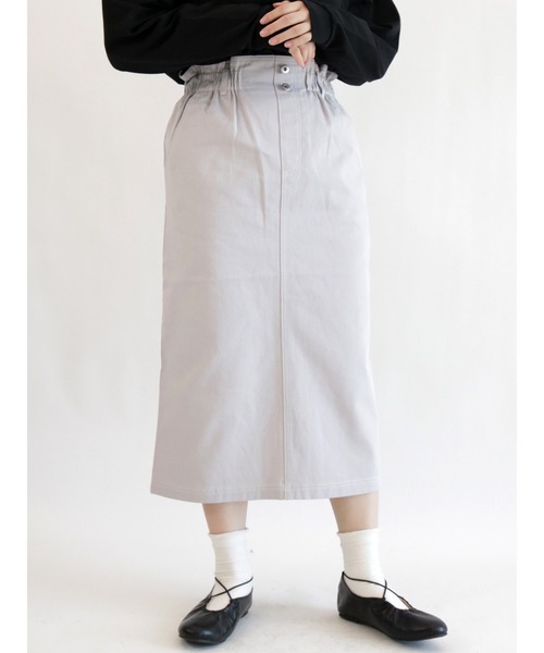 ウエストの程よいフリルがポイントのタイトスカート。 一見シンプルなタイトスカートですがウエスト部分がゴム仕様になっておりフリルデザインでさり気ない甘さをプラス。 カラーによってはステッチラインが見えるのも魅力的です。