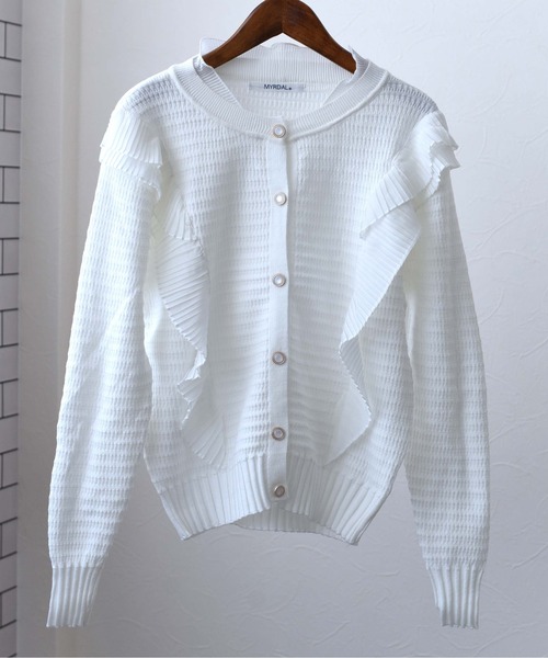 2022 Spring Collectionデコラティブな表情で女らしさをアピール♡ ニットカーディガンの首元に、プリーツのフリルを贅沢に重ねて配置。パール調ボタンもひときわフェミニンさと、甘すぎない印象でスタイリングを上品に仕上げてくれます。 デニムはもちろん、スカートと合わせてデートスタイルにもおすすめです♪※撮影場所やイメージにより、実際の商品と色味が若干異なる場合がございます。※サイズに若干の個体差が生じる場合がございます。予めご了承下さい。【オススメの機能について】《商品のお気に入り登録》により、完売カラーの再入荷通知、ラスト1点の通知、セールの通知も受け取ることができます!《ブランドのお気に入り登録》により、新商品や再入荷など、イチ早くブランドのお得なセールやクーポン配布などの情報を受け取ることができます!お得な情報をGETして頂く為にも、是非ご活用くださいませ