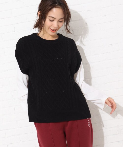 ■デザイン ざっくり編みたてた、ケーブル編みがシーズンムード漂うニットベスト♪ 広めにとったアームホールがゆるっとムードをさりげなく運び、おしゃれな印象に。 Tシャツがセットになっているのでコーデも悩みいらず。 それぞれ単品でも着まわせるのでコーデの幅が広がること間違いなしです☆ ■生地感 ニットは軽さのあるソフトな風合い、Tシャツは中肉の仕上がりです。 ■STAFF着用コメント 柔らかいタッチが印象のニットベスト×ロンTで伸縮性もあり着やすいセットです♪ ネック部分が丸いデザインで女性らしく優し気な印象です〇 ケーブル編みのデザイン性が1枚でお洒落見えすること間違いなしです♪ ■スタイリング 長すぎず短すぎない程よい丈感でパンツにもスカートスタイルにも着られます! ワイドパンツに合わせてカジュアルに、フレアなスカートと合わせてキレイ目にも幅広く合わせられるのも嬉しいポイント♪ もちろん!セットでも着られますが、ベストはサイドにスリットが入っていて裾が長めのインナーに合わせてレイヤードスタイルもおすすめ〇 ロンTはシンプルながらもお袖がやや広がったお洒落ポイントがあり、キャミワンピース・ジャンスカのインナーに着たり、上にたっぷりカーディガンを羽織ったりと別々でも活躍します♪ #CutieBlonde#Cutie#cutieblonde#cutie#キューティブロンド#キューティ#20代#30代 こちらの商品は主に春に着用いただける商品です。 モデル情報:身長167cm B79 W59 H87 着用サイズ:02(M) 店舗へのお問い合わせ商品番号:256-14008 ●製品寸法: 01(S):ベスト着丈55cm ベストB106cm ベスト肩幅55cm インナー着丈49cm インナーB98cm インナー袖丈52cm インナー肩幅42cm 02(M):ベスト着丈58cm ベストB110cm ベスト肩幅56cm インナー着丈52cm インナーB102cm インナー袖丈53cm インナー肩幅43cm 03(L):ベスト着丈61cm ベストB114cm ベスト肩幅57cm インナー着丈55cm インナーB106cm インナー袖丈54cm インナー肩幅44cm 備考: